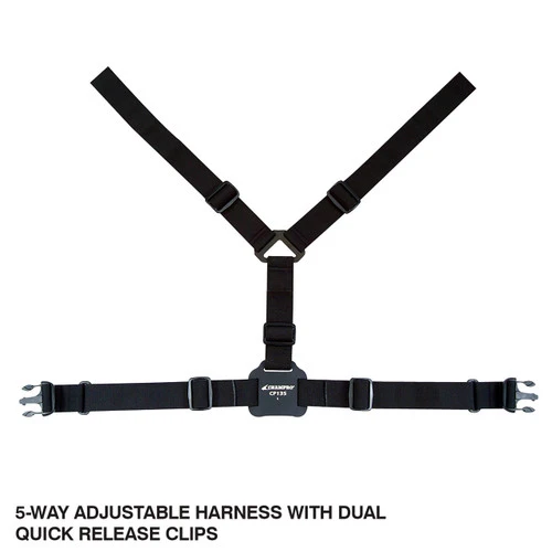 - 5-way adjustable harness with dual quick release clips