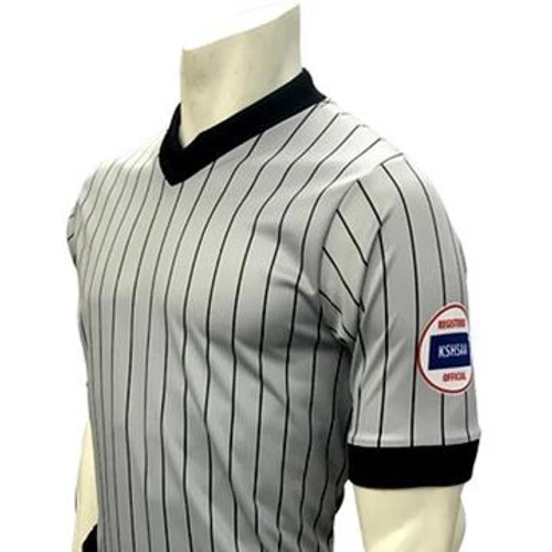 Grey pinstripe referee shirt for Kansas high school officials. Features the KSHSAA Registered Official logo dye sublimated on left sleeve. This soft and lightweight 100% performance management mesh fabric. Black rib knit collar and sleeve ends. Tight “V” neck opening with loop to attach your lanyard. Smitty USA has become the leader in manufacturing of dye sublimated shirts for sports officials nationwide.