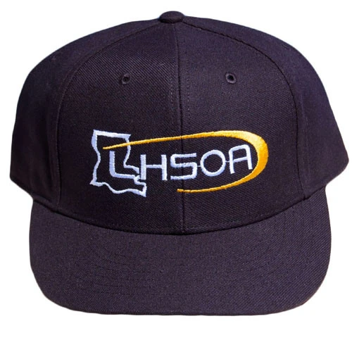 Louisiana LHSOA Fitted Black 4-stitch Umpire Plate Cap. Black fitted umpire cap with the Louisiana LHSOA logo embroidered on the front. Fitted sizes 6 3/4 through 8. Has 2″ 4-stitch visor.