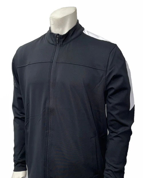 Lightweight pre-game jacket with pockets for NCAA basketball officials. With an outer shell made of 100% polyester and offers a 100% nylon lining for performance and style. Design features white stripes over the shoulder, at the waistband, and on the wrist cuffs. Zippered front with nylon lining. A very nice pre-game jacket for all sports.