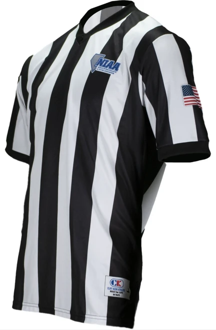 Nevada NIAA 2 1/4″ Men’s Dye Sublimated Basketball Referee Shirt. Exclusively for basketball officials in Nevada. Featuring a special 2 1/4″ stripe pattern with the wide black side panels, this shirt will look sharp on the basketball court. No more patches. Your U.S. Flag is actually dyed directly in the fabric, on the left sleeve, and the NIAA logo is seamlessly dyed into the shirt on the chest. Your flag and crest are placed in the same spot on every shirt.