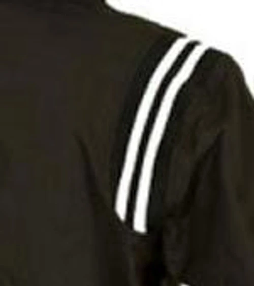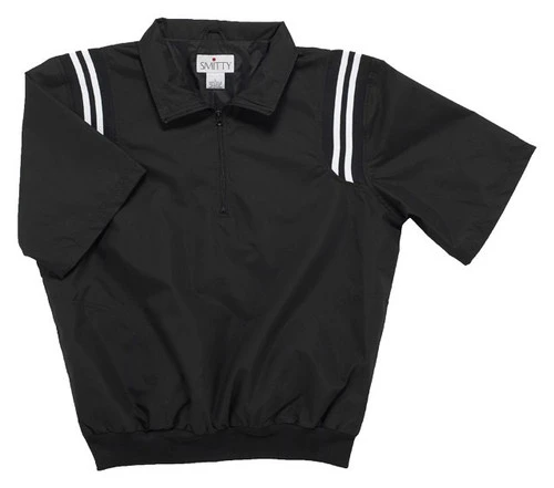 Smitty Half Sleeve Umpire Pullover Black with Black and White Trim. Has black micro-fiber shell, stand-up collar, nylon lining, and black and white stripes over the shoulders. Side seam pockets.