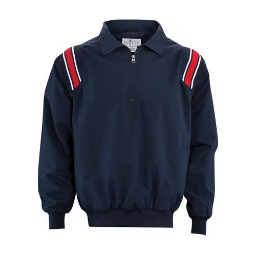 Navy Umpire Pullover with Red and White Trim. Water resistant micro-fiber shell, stand-up collar, nylon lining, and half zipper collar that can lay flat or zip around the neck. Can be worn tucked into your pants or untucked. Side seam pockets.
