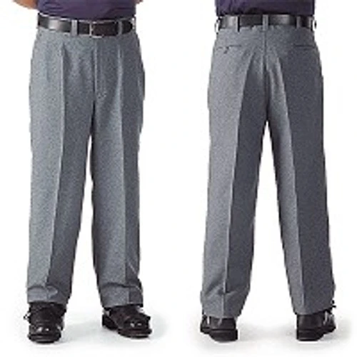 Features a standard waistband. Heather gray 100% polyester pleated front. Wide 1.75″ belt loops, button loop on back pocket, double seat panel and more room in the legs for shin guards. Can be worn behind the plate or on the bases. Pants are unhemmed.