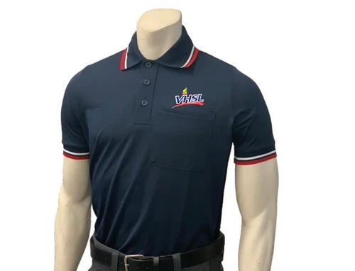 Navy umpire shirt made with high performance Body Flex® Style fabric. Navy with Red, navy and white trim on collar and cuffs. Embroidered Virginia VHSL loge above the left chest pocket. Designed to be durable and cool. The Body Flex® Style high performance moisture wicking fabric is strong to undertake the wear and tear that umpires put on their clothing, but breathes to help keep you cool. Matching stripe tipped collars and banded cuffs. Double needle left chest pocket and hems with 3 button placket. Extra tuck-in length split tail bottom.